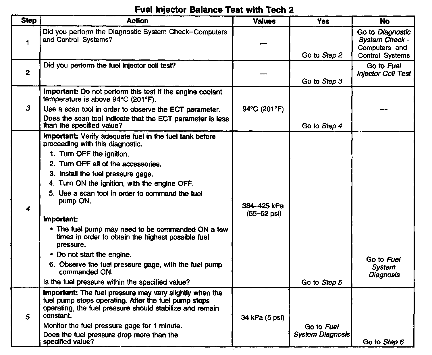 5. The fuel pressure should reach a steady value. Refer to Fuel System Diagnosis if the fuel pressure does not stabilize. Component Tests and General Diagnostics