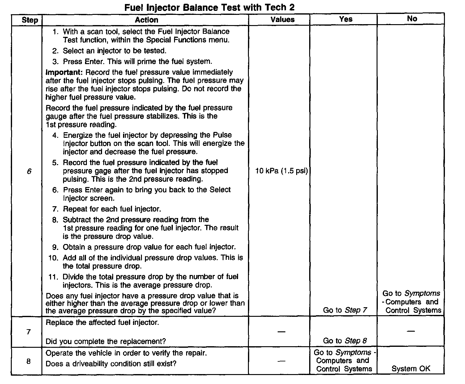 6. If the pressure drop value for each fuel injector is within 10 kPa (1.5 psi) of the average pressure drop value, the fuel injectors are flowing properly. Calculate the pressure drop value for each fuel injector by subtracting the second pressure reading from the first pressure reading.