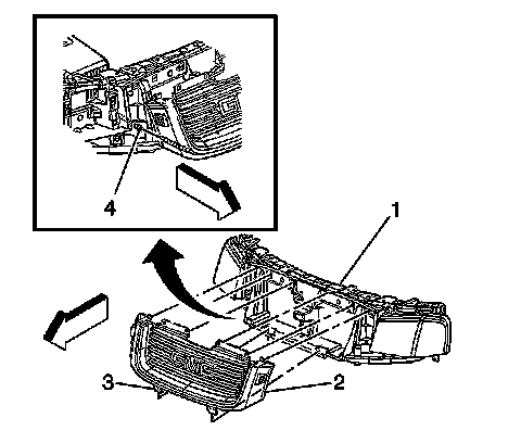 6. Position the grille (2) onto the headlamp panel assembly (1) such that the lower locating tabs (3) are properly aligned.