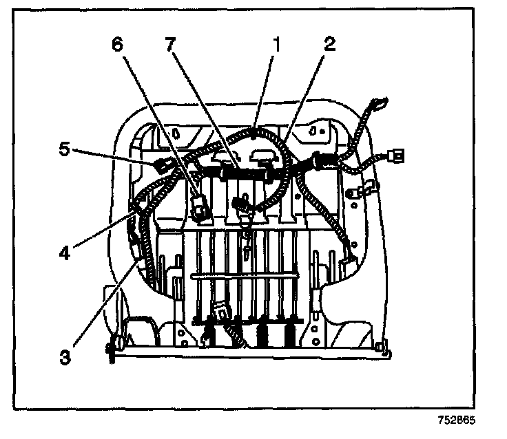 6. Install the SIR harness (2) to the seat clips (1, 4).