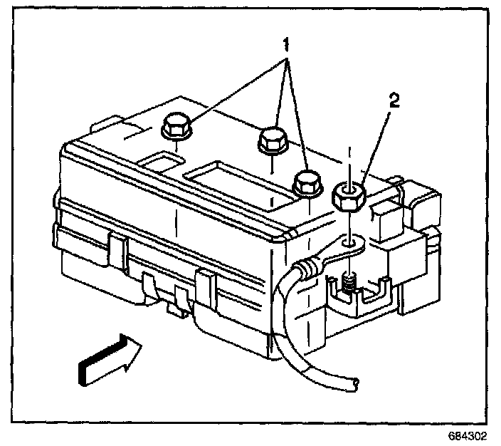 5. Remove the battery feed terminal nut (2) from the junction block.