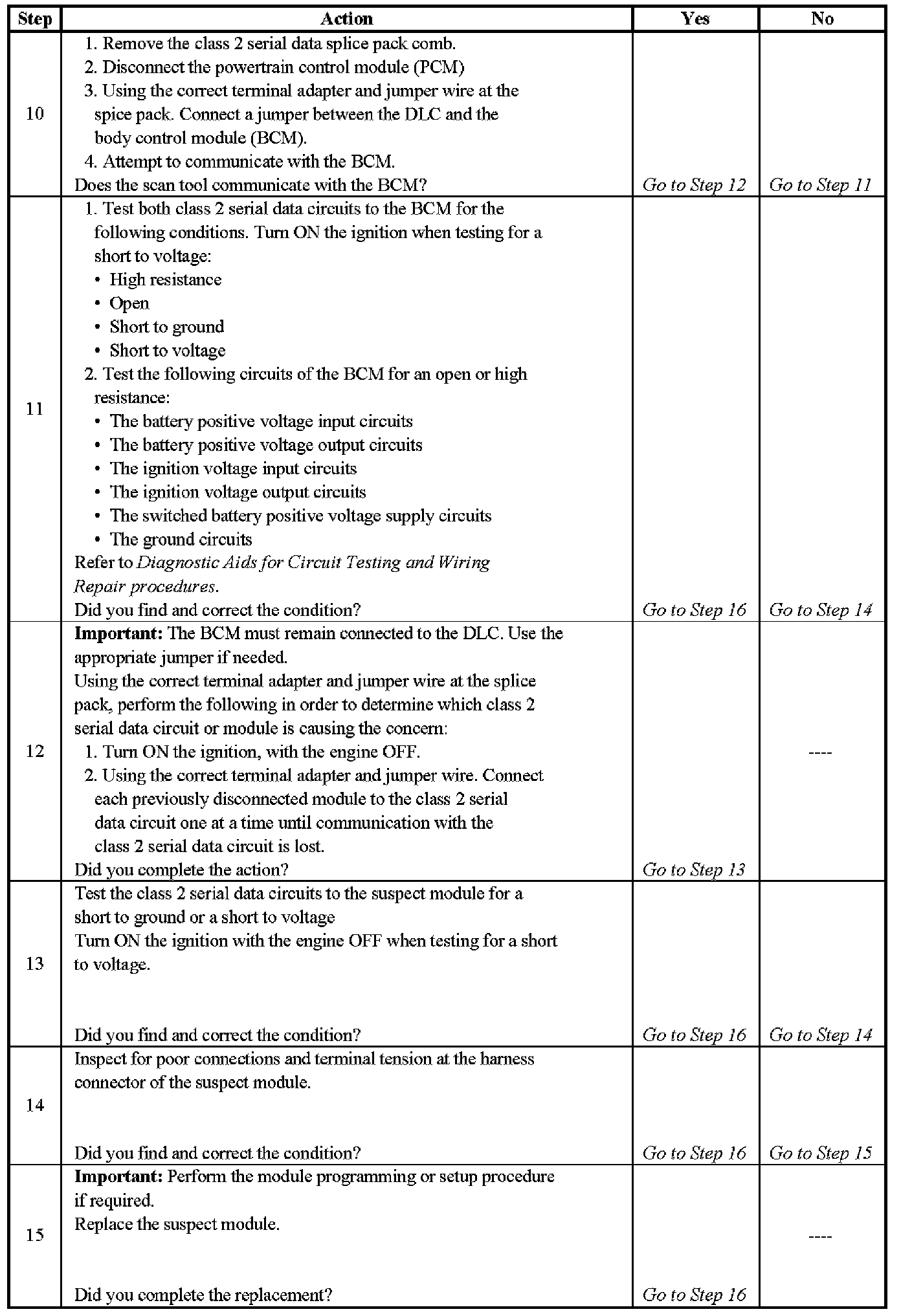 10. Normal class 2 serial data communication cannot take place until the body control module (BCM) sends the appropriate power mode message. If the BCM does not send a wake-up message, other modules on the class 2 serial data circuit may not communicate.