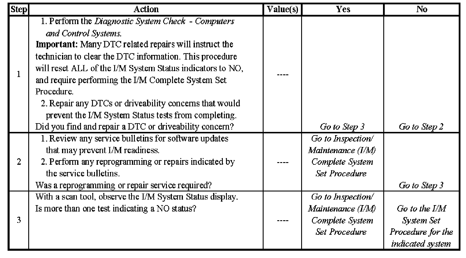 1. Any DTCs set, even those that are not listed in the Inspection/Maintenance System DTC Table, may prevent the required DTCs from running. If there is any question as to whether a set DTC is disabling the required I/M diagnostic, review the Conditions for Running in the diagnostic procedures for the DTC required by the I/M diagnostic. A list of disabling DTCs, if applicable, is contained in the supporting text for that DTC.