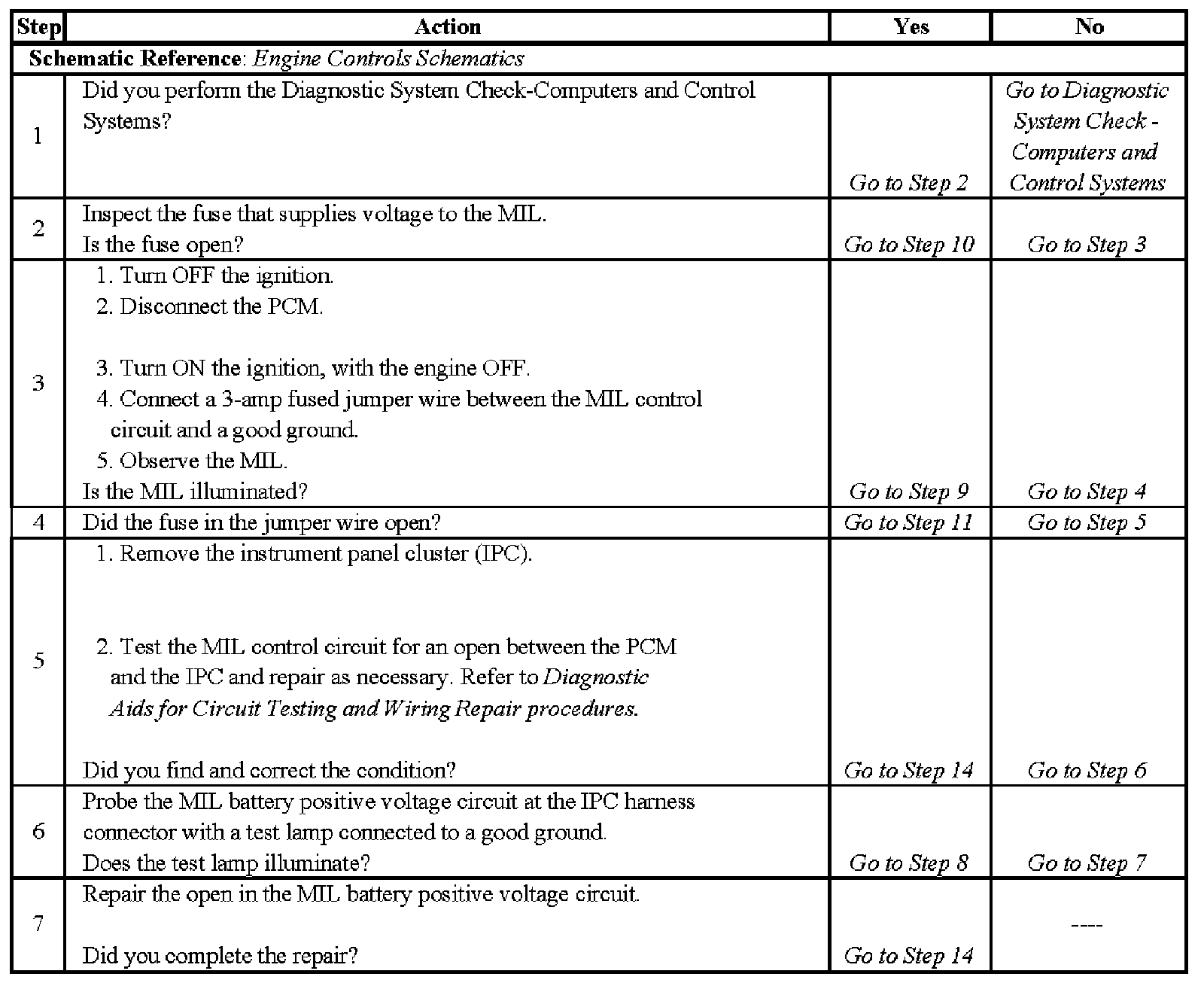 Malfunction Indicator Lamp (MIL) Inoperative - Steps 1-7: