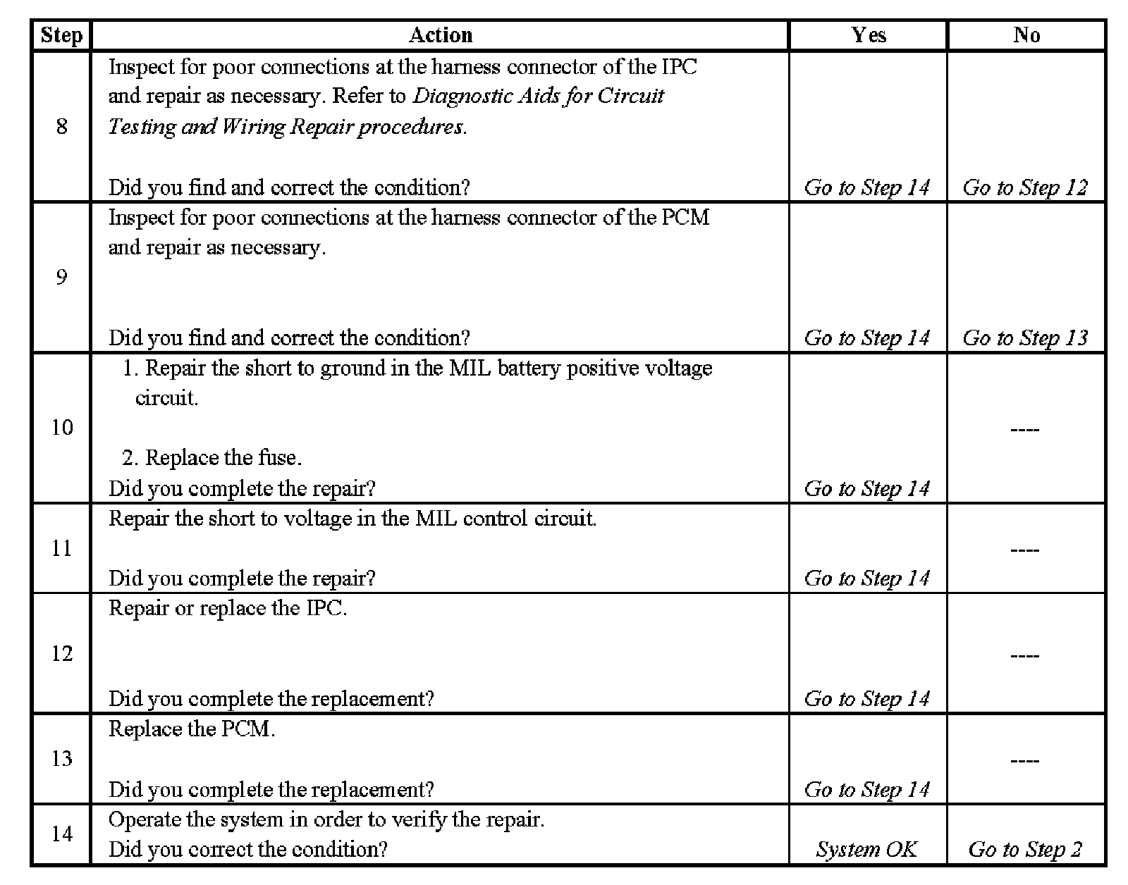 Malfunction Indicator Lamp (MIL) Inoperative - Steps 8-14: