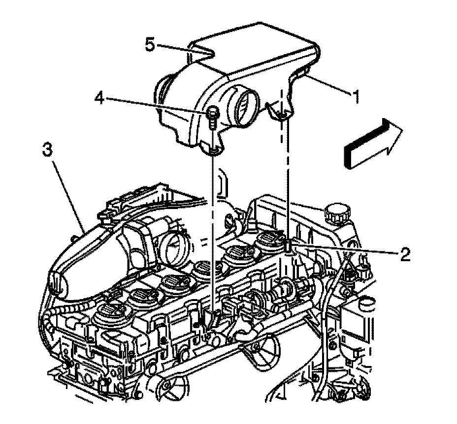 3. Install the 2 resonator to engine bolts (4) to the air cleaner outlet resonator (5). Tighten the bolts to 6 Nm (63 lb in).