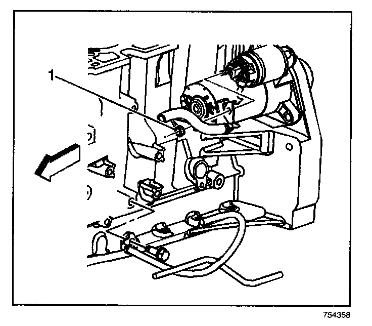 3. Remove the battery positive lead from the solenoid (1).
