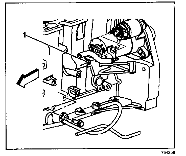 6. Remove the starter mount bolt and nut (1, 2).