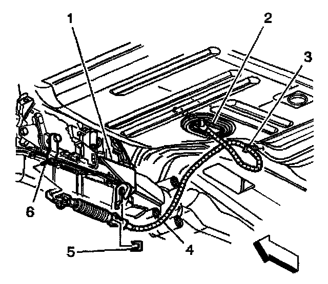 6. Remove the cable from the retainer (3) on the floor panel. If the vehicle is equipped with 4WD, remove the cable from the retainers located on the transfer case.