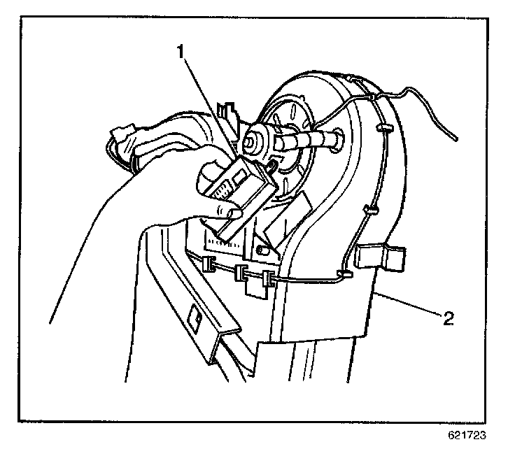 5. Remove the blower motor processor (1) from the HVAC module (2).
