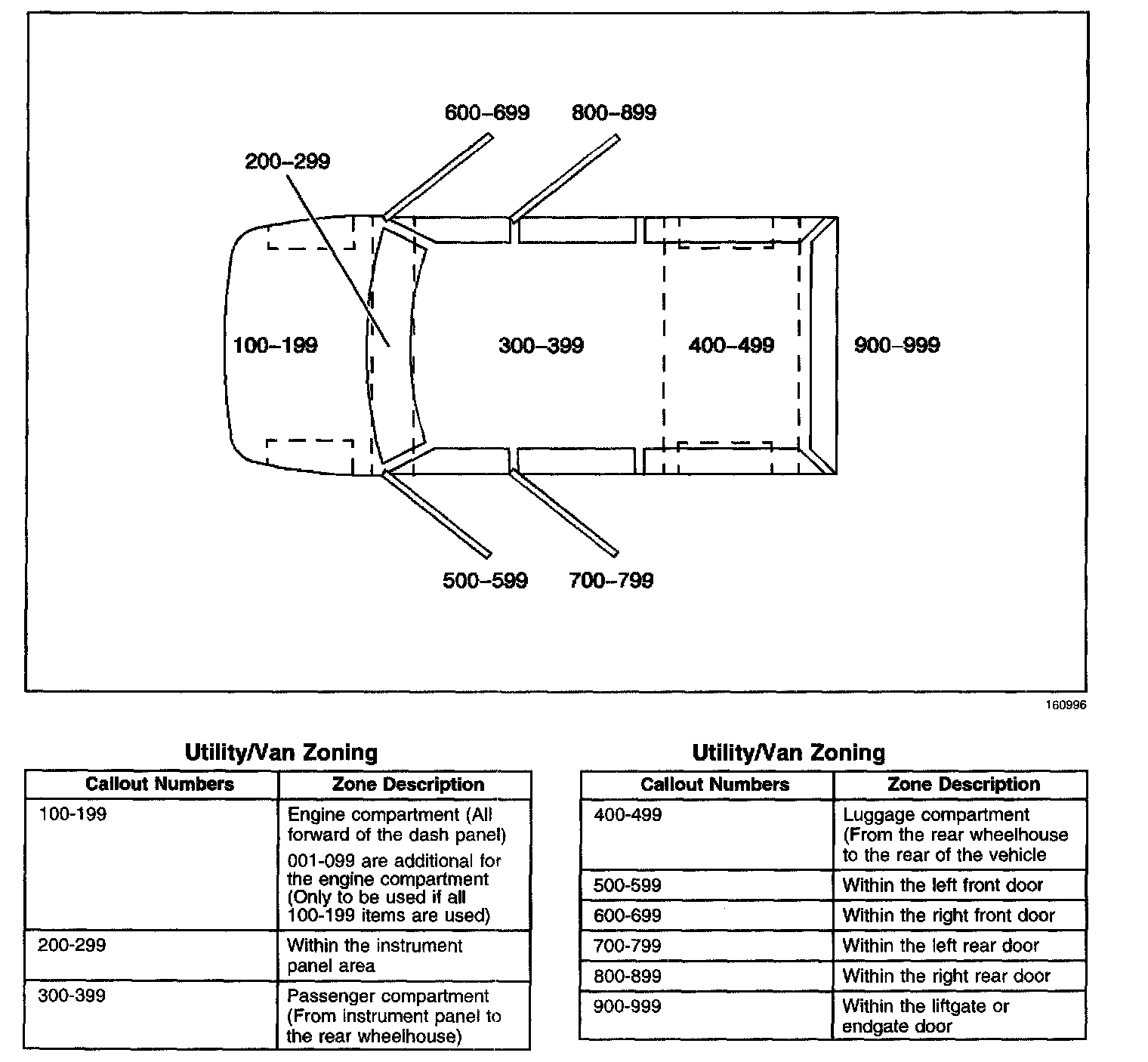 All grounds, in-line connectors, pass-through grommets, and splices have identifying numbers that correspond to where they are located in the vehicle. The table explains the numbering system.