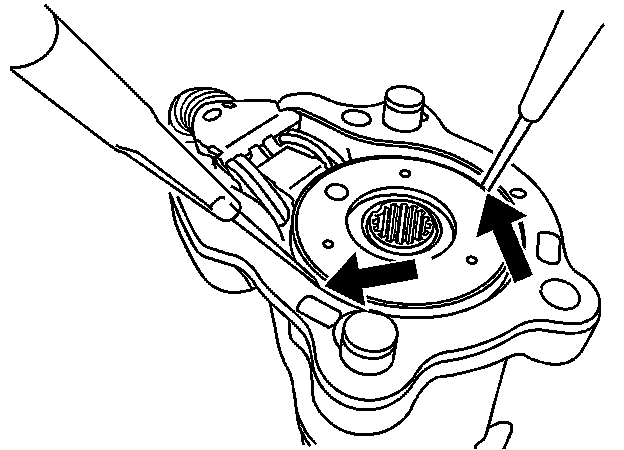 5.2. At the other end of the gasket/cover plate, place a flathead screwdriver tip (1) between the gasket/cover plate and the motor housing near the "dual" locking tabs. Twist the screwdriver clockwise/counterclockwise at both sides until the locking tabs break and the gasket/cover plate comes off.