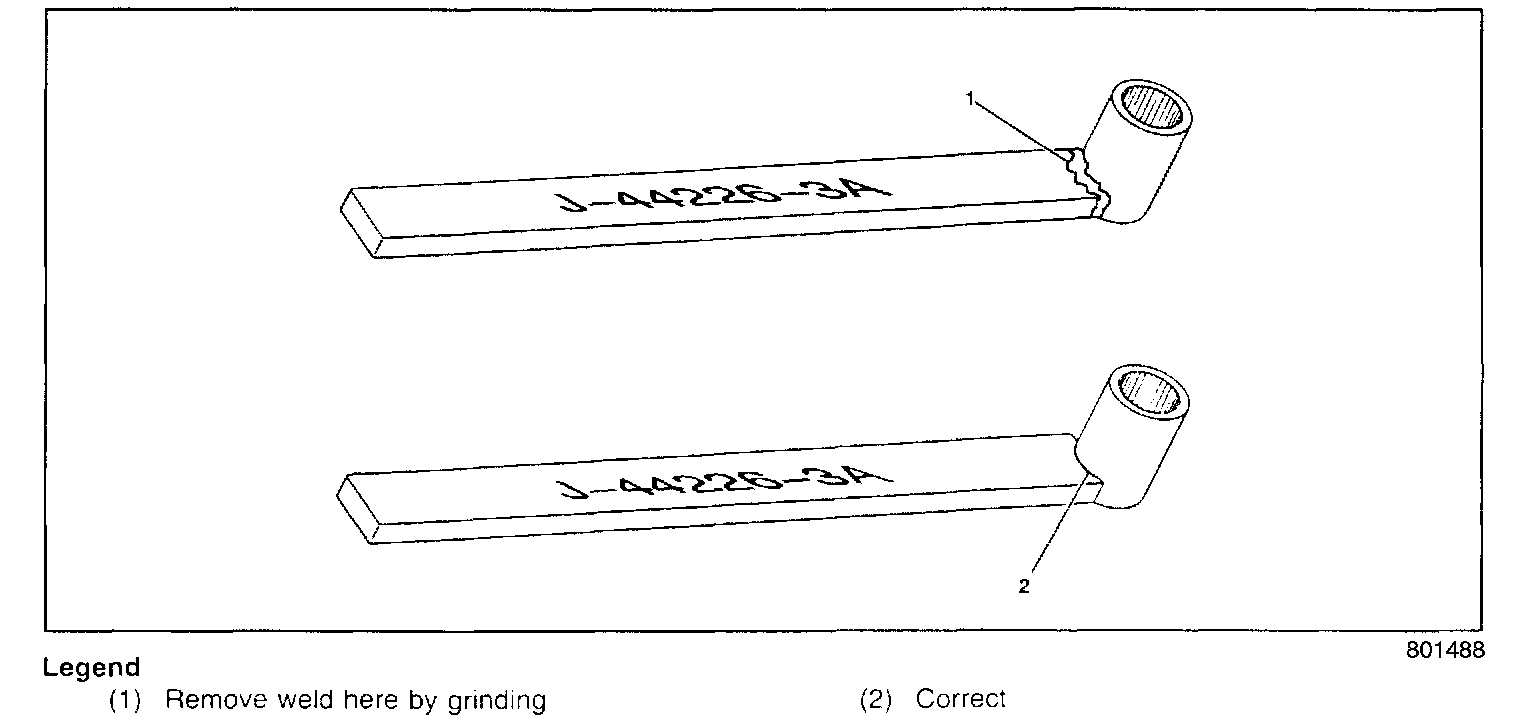 Inspect tool J 44226-3A in the area shown. Remove excessive weld using a grinder. If a grinder is not available, or you cannot adequately remove the excess weld, call Kent-Moore Tools at 1-800-GM TOOLS for a free replacement.
