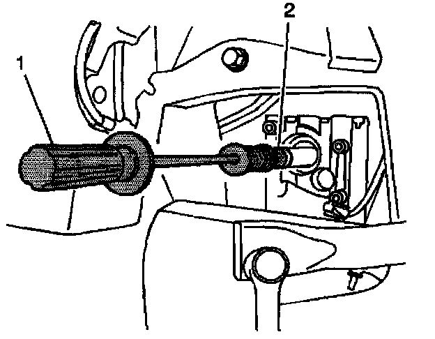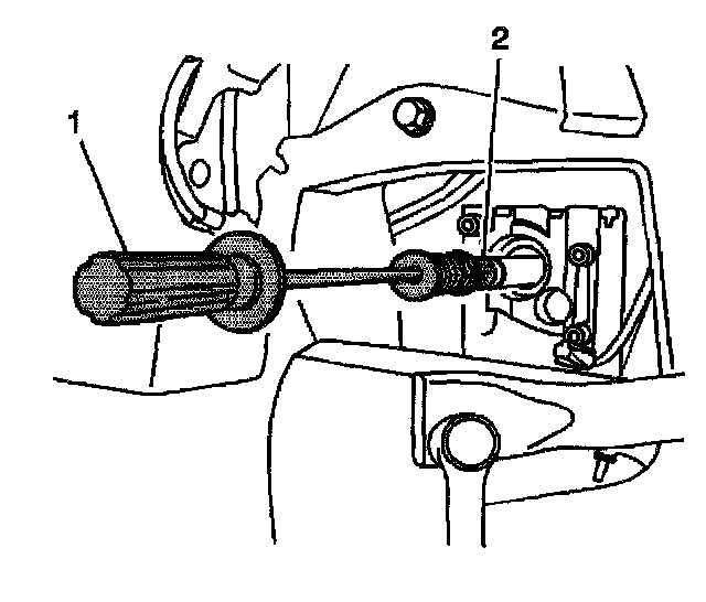 3. Using the J 6125-B (1) and the J 45104 (2), carefully guide the inner axle shaft through the oil pan and differential carrier assembly oil seal into the differential side gear turning as necessary in order to align the inner axle shaft splines with the differential side gear splines.