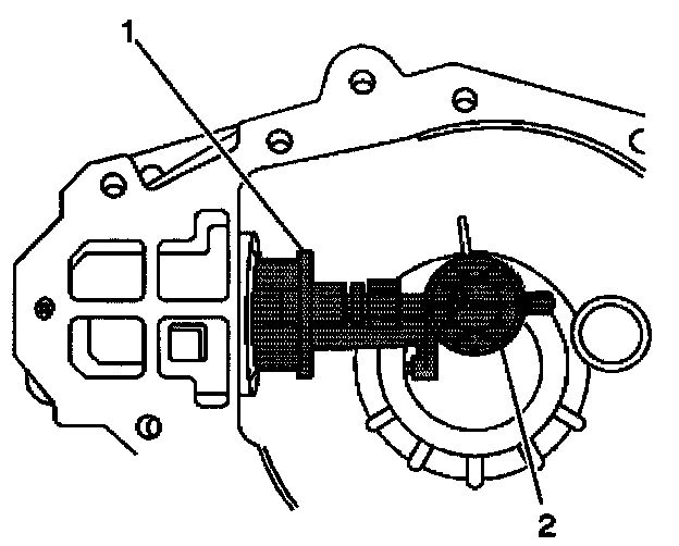 3. Install the J 33838-2 (1) and the bolt (2) with the outer pinion bearing into the differential carrier assembly case half.