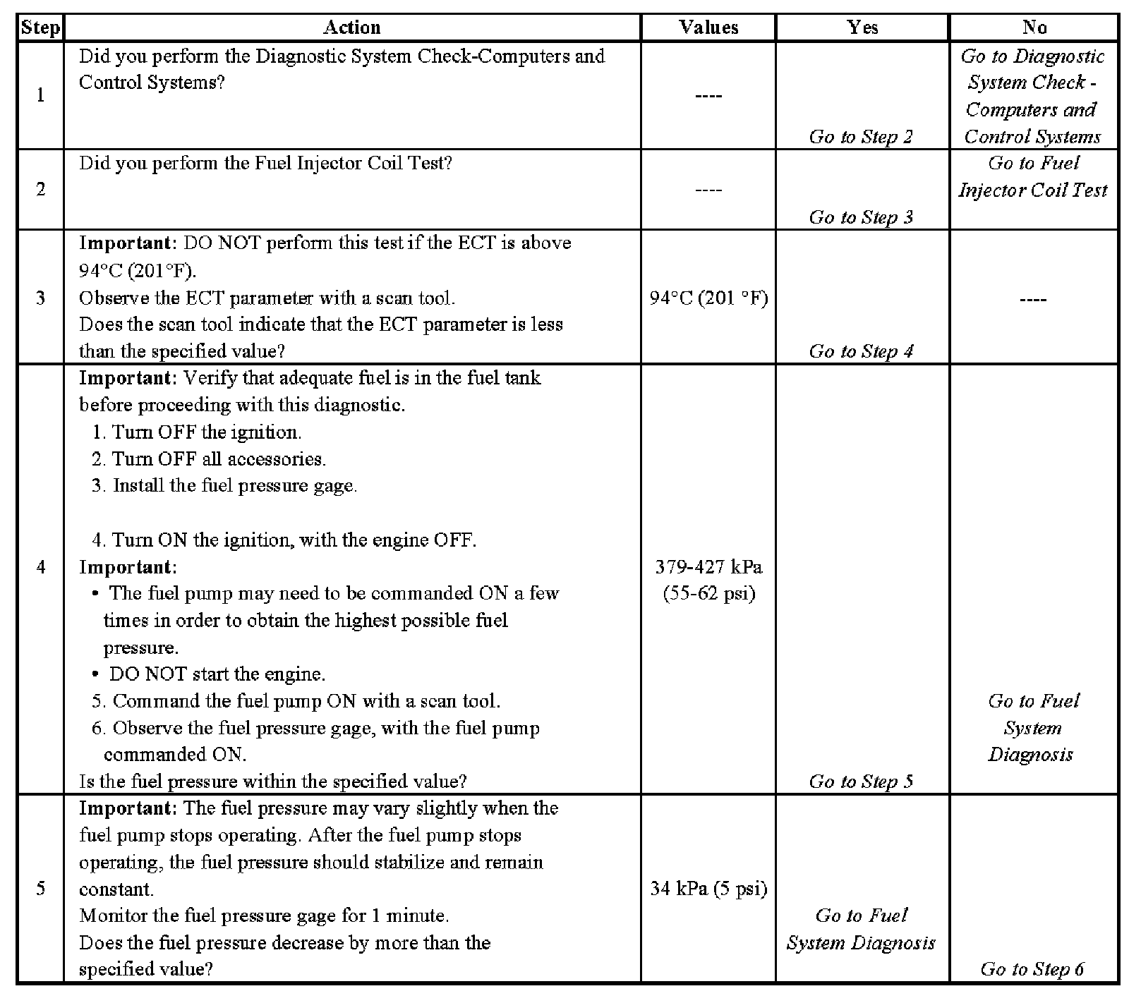 5. The fuel pressure should reach a steady value. Refer to Fuel System Diagnosis if the fuel pressure does not stabilize. Component Tests and General Diagnostics