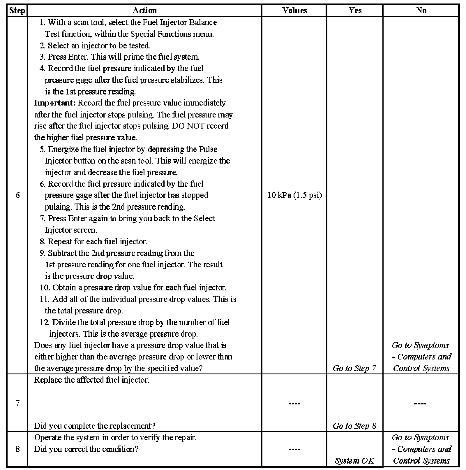 6. If the pressure drop value for each fuel injector is within 10 kPa (1.5 psi) of the average pressure drop value, the fuel injectors are flowing properly. Calculate the pressure drop value for each fuel injector by subtracting the second pressure reading from the first pressure reading.