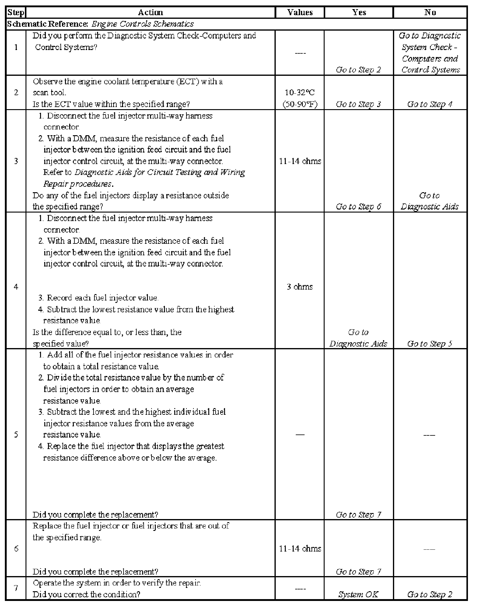 3. This step tests each fuel injector resistance within a specific temperature range. If any of the fuel injectors display a resistance outside the specified value, replace the fuel injector.