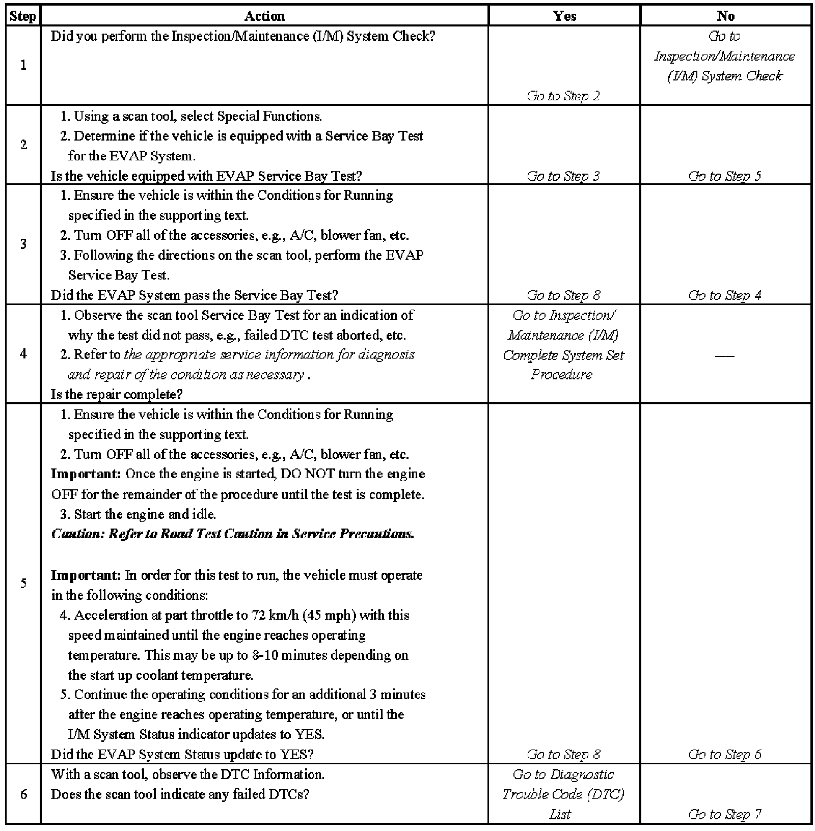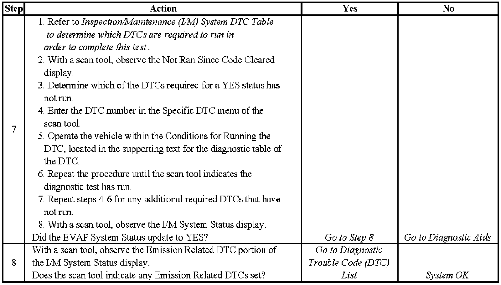 6. This step identifies a first failure of a type B DTC. A DTC only appears on the I/M System Status display when it becomes a MIL illuminating DTC. This occurs on the second failure of a type B DTC. A first failure of a type B DTC will not allow the I/M System Status to update to YES. Refer to Diagnostic Aids.