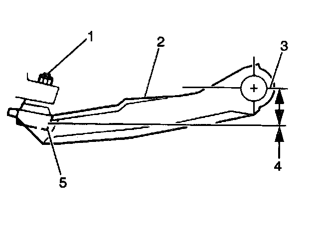 4. Measure from the pivot bolt center line (3) down to the lower corner (5) of the lower ball joint (1) in order to obtain the Z height measurement (4).