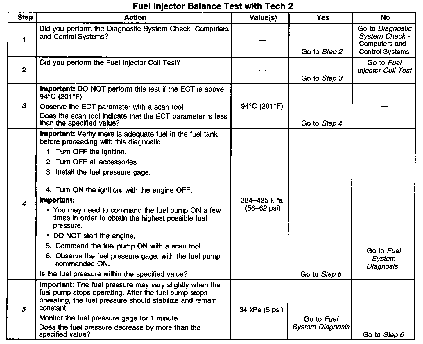 5. The fuel pressure should reach a steady value. Refer to Fuel System Diagnosis if the fuel pressure does not stabilize. Component Tests and General Diagnostics