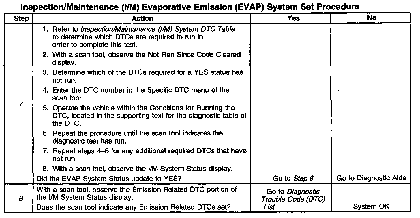 6. This step is to identify a first failure of a type B DTC. A DTC only appears on the I/M System Status display when the DTC becomes a MIL illuminating DTC. This occurs on the second failure of a type B DTC. A first failure of a type B DTC will not allow the I/M System Status to update to YES. Refer to Diagnostic Aids.