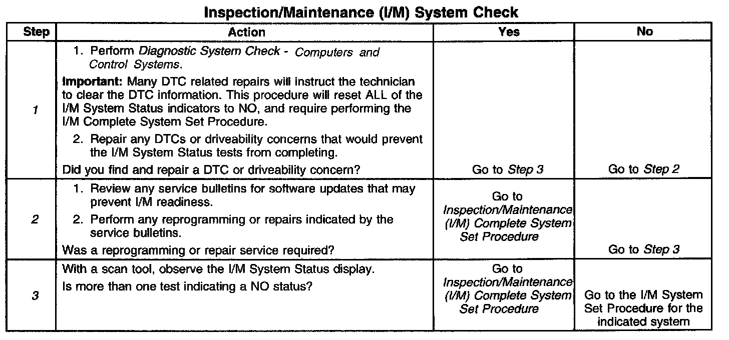1. Any DTCs set, even those that are not listed in the Inspection/Maintenance System DTC Table, may prevent the required DTCs from running. If there is any question as to whether a set DTC is disabling the required I/M diagnostic, review the Conditions for Running in the diagnostic procedures for the DTC required by the I/M diagnostic. A list of disabling DTCs, if applicable, is contained in the supporting text for that DTC.