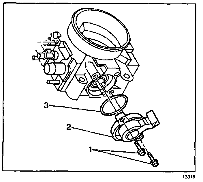 1. With the throttle valve in the normal closed (idle) position, install the TP sensor (2) and the seal (3) on the throttle body assembly.