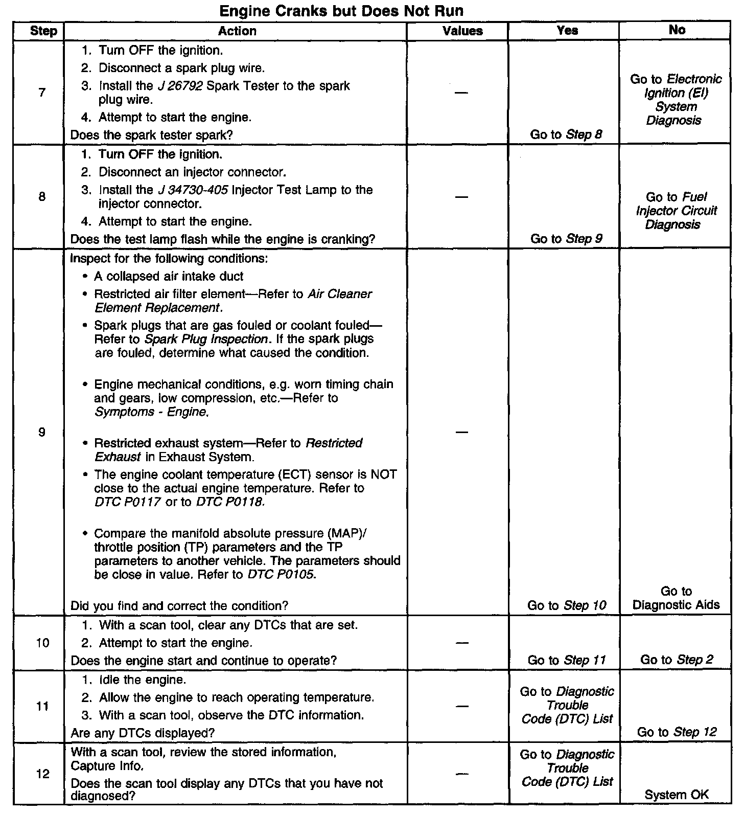 DESCRIPTIONThe Engine Cranks but Does Not Run diagnostic table is an organized approach to identifying a condition that causes an engine not to start. The Engine Cranks but Does Not Run diagnostic table directs the service technician to the approach system diagnosis.