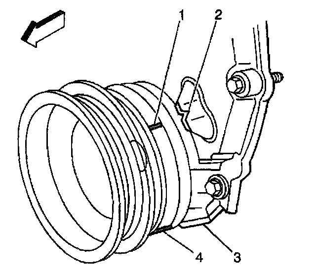 Distributor InstallationImportant: The engine front cover has 2 alignment tabs and the crankshaft balancer has 2 alignment marks (spaced 90 degrees apart) which are used for positioning number 1 piston at Top Dead Center (TDC). With the piston on the compression stroke and at top dead center, the crankshaft balancer alignment mark (1) must align with the engine front cover tab (2) and the crankshaft balancer alignment mark (4) must align with the engine front cover tab (3).