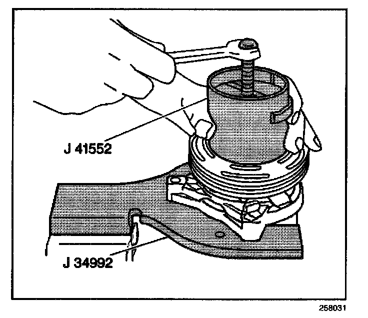 12. Thread the through bolts into the J 34992. Ensure that the thread of the through bolts engage the full thickness of the J 34992.