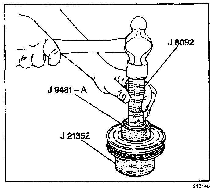 1. Place the pulley rotor on the J 21352-A in order to fully support the rotor hub during bearing installation.