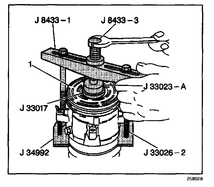 13. Tighten the center screw in the J 8433-1 in order to force the pulley rotor and bearing assembly onto the compressor front head.