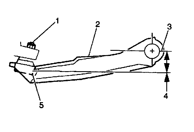 4. Measure from the pivot bolt center line (3) down to the lower corner (5) of the lower ball joint (1) in order to obtain the Z height measurement (4).