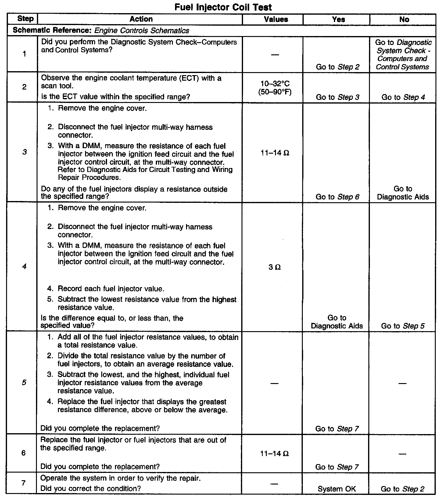 4. This step determines if all of the fuel injectors are within 3 ohms of each other. If the highest resistance value is within 3 ohms of the lowest resistance value, then all of the fuel injector coil windings are OK.