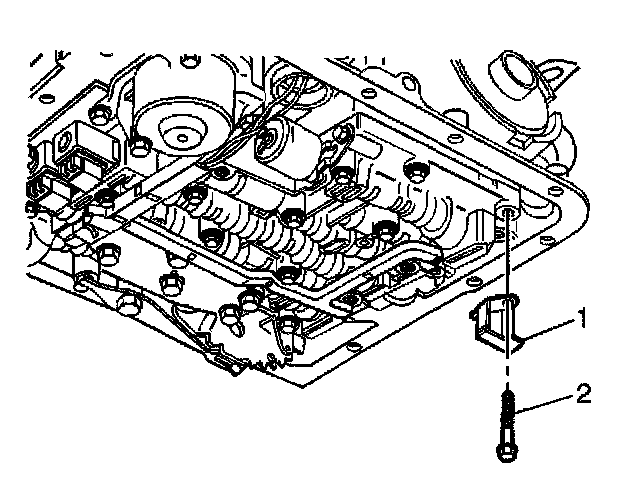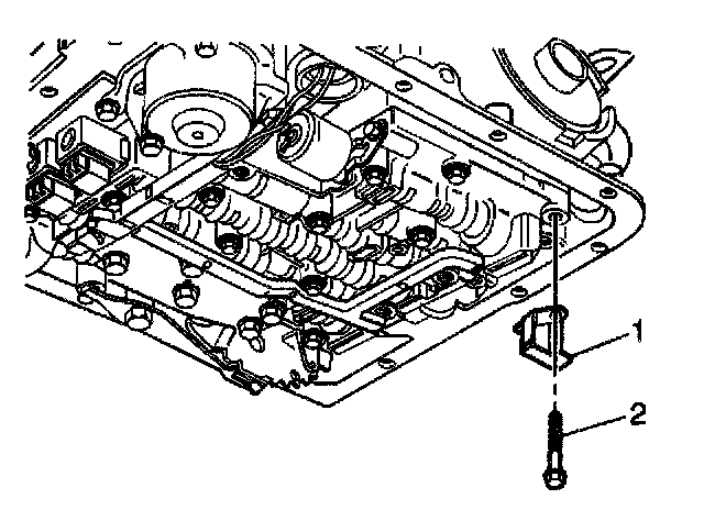 18. Install the transmission fluid indicator stop bracket (1) and bolt (2).