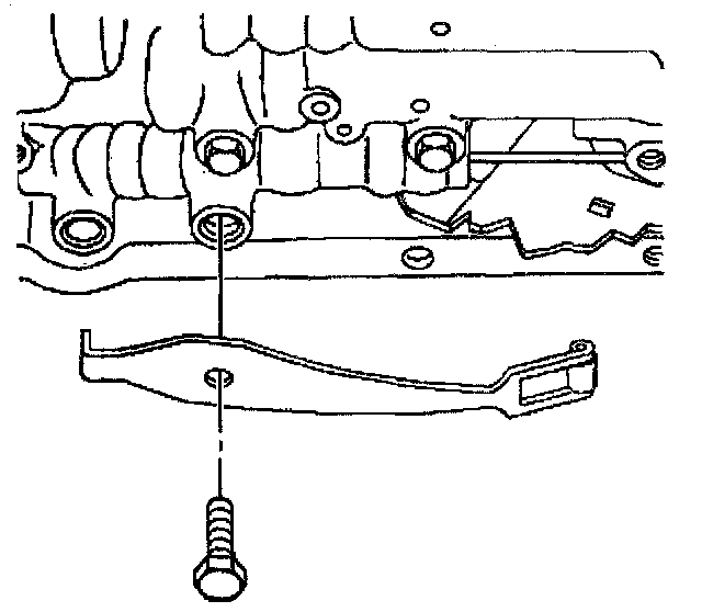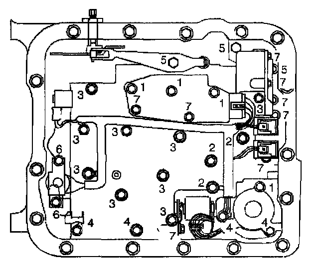 5. Do not install the transmission fluid indicator stop bracket and bolt at this time. Install but do not tighten the control valve body bolts which retain only the valve body directly. Each numbered bolt location corresponds to a specific bolt size and length, as indicated by the following: