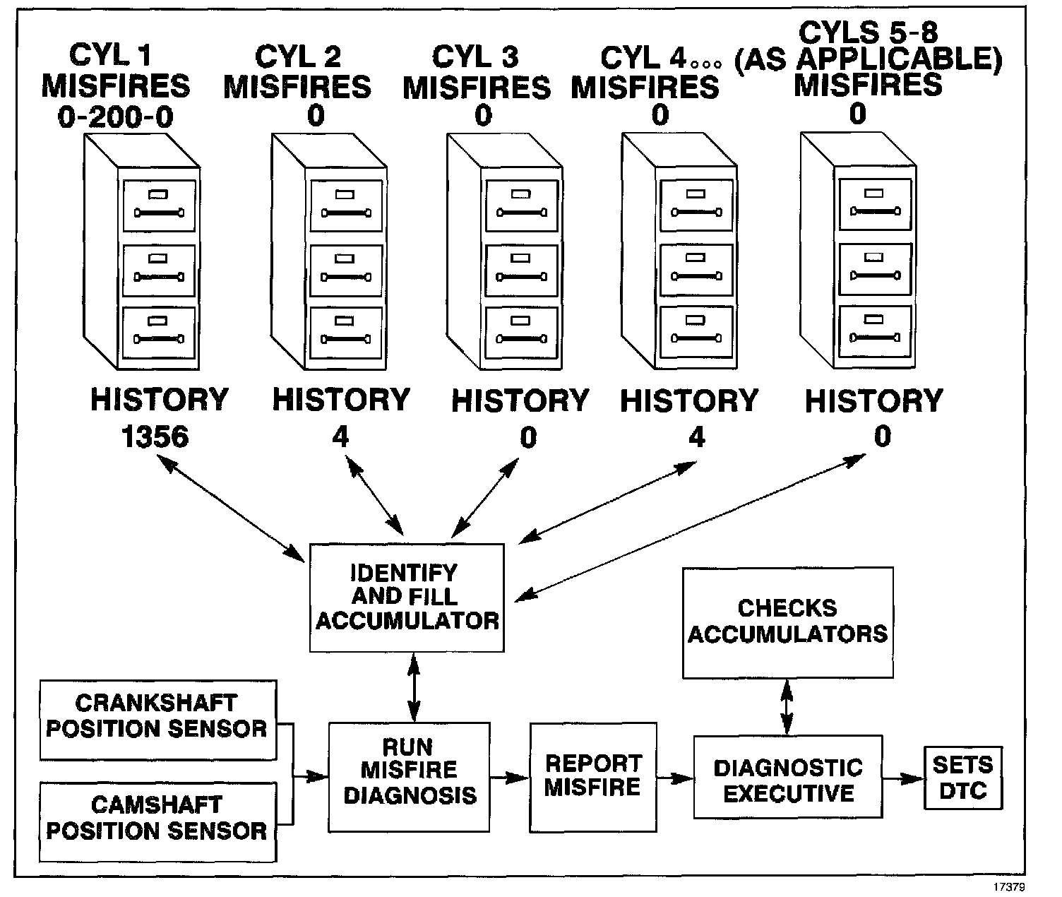 Whenever a cylinder misfires, the misfire diagnostic counts the misfire and notes the crankshaft position at the time the misfire occurred.