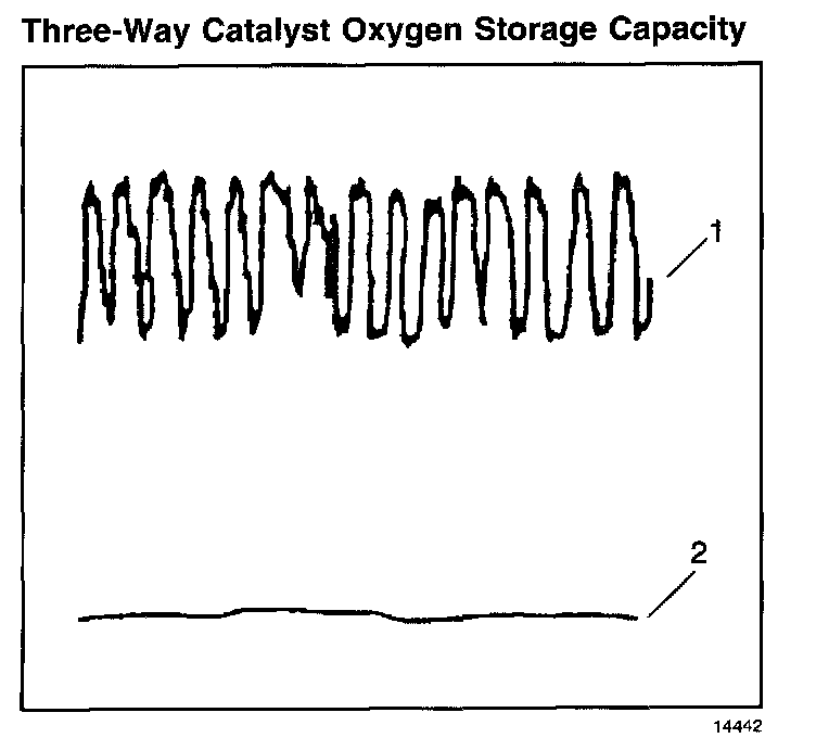 The PCM must monitor the 3-way catalyst system (TWC) for efficiency. In order to accomplish this, the PCM monitors the pre-catalyst and post-catalyst oxygen sensors. When the TWC is operating properly, the post-catalyst (2) oxygen sensor shows significantly less activity than the pre-catalyst (1) oxygen sensor. The TWC stores oxygen during the normal reduction and oxidation process. The TWC releases oxygen during its normal reduction and oxidation process. The PCM calculates the oxygen storage capacity using the difference between the pre-catalyst and post-catalyst oxygen sensor voltage levels.