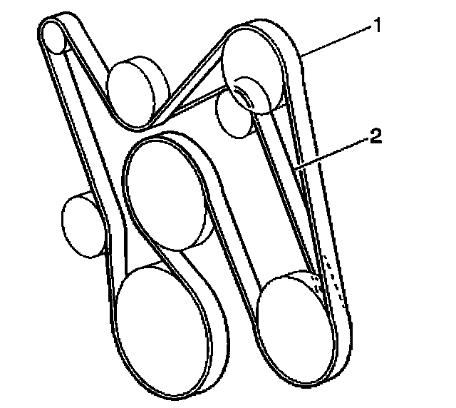 12. If equipped without A/C, remove the drive belt (2) from the pulleys and the tensioner.