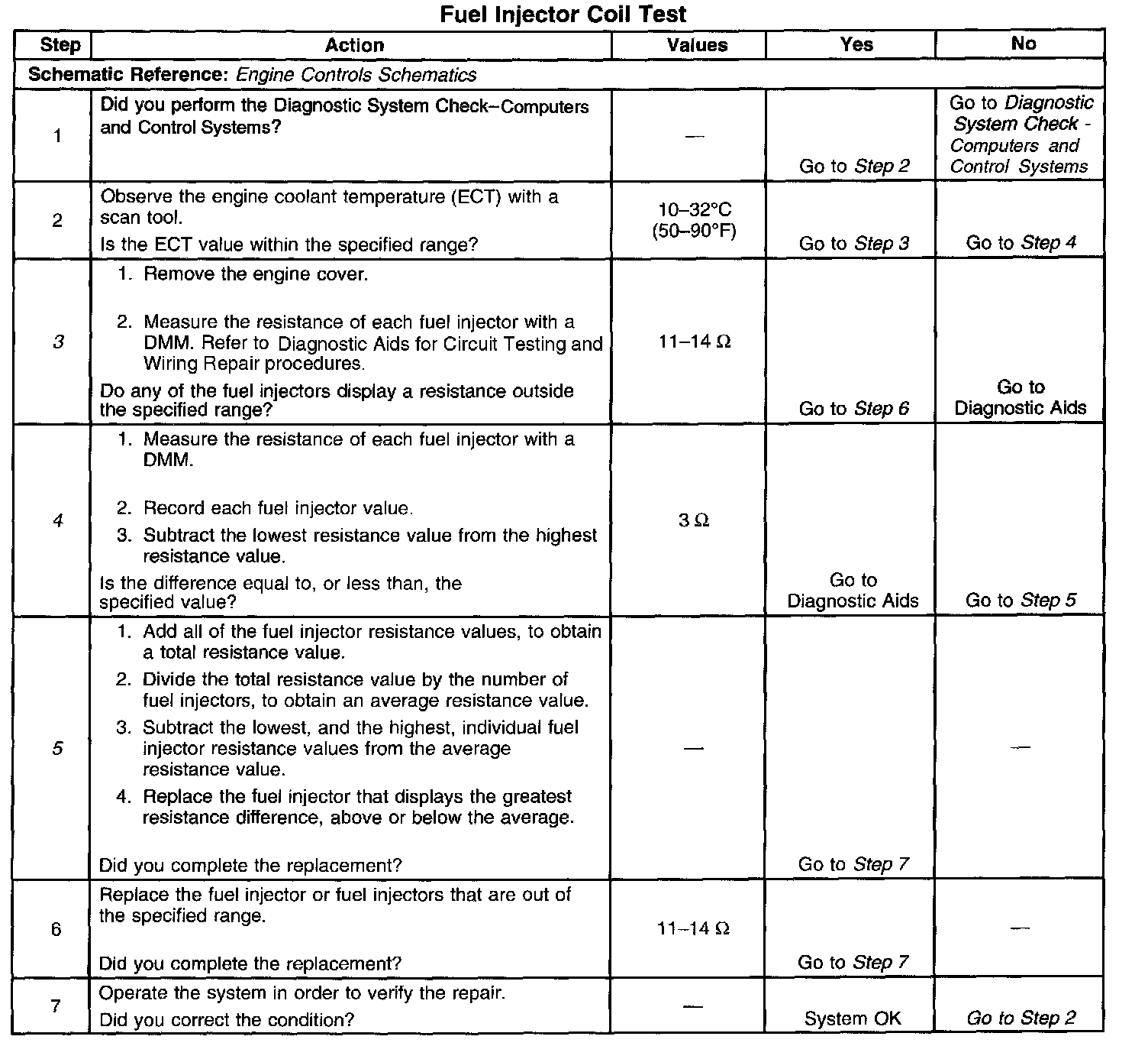 ^ Perform the fuel injector coil test within the conditions of the customers concern. A fuel injector condition may only be apparent at a certain temperature, or under certain conditions.