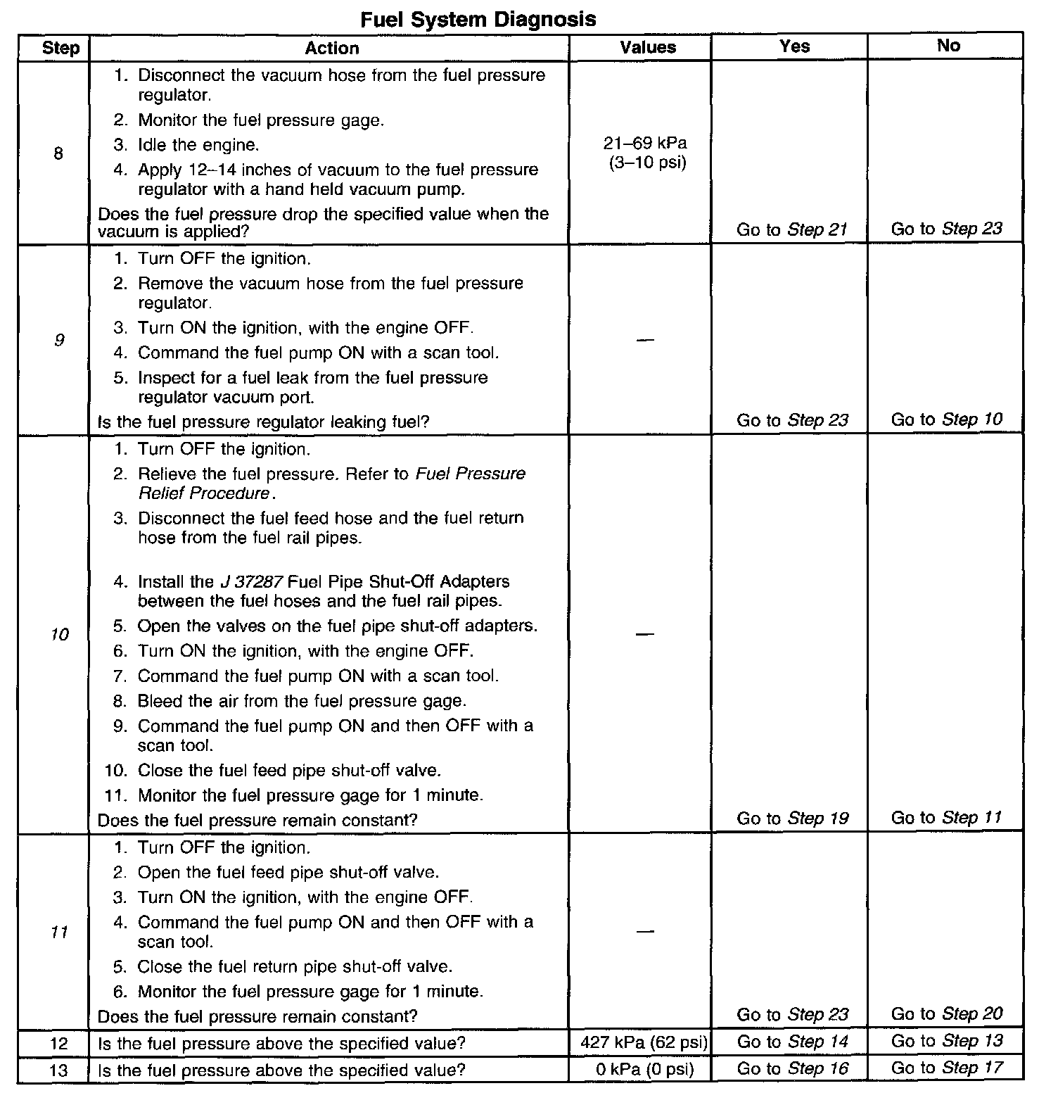 11. This step tests for a leaking fuel injector, or fuel pressure regulator. If the fuel pressure remains constant during this test, the fuel injectors are not leaking fuel.
