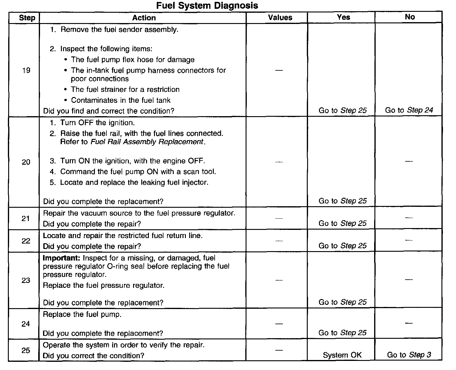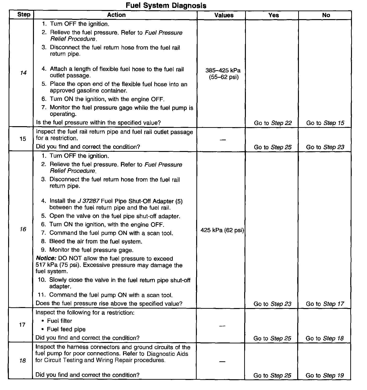 14. This step tests for a restricted fuel return pipe. If the fuel pressure is within the specified values, a restriction in the fuel return pipe is indicated.