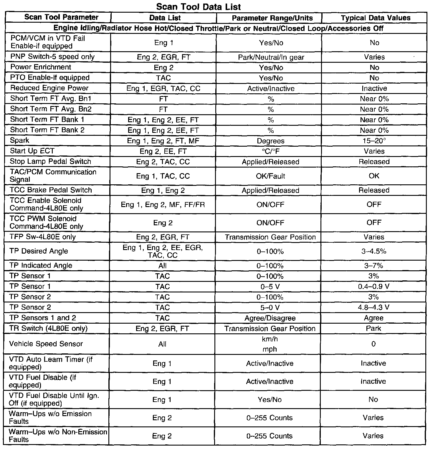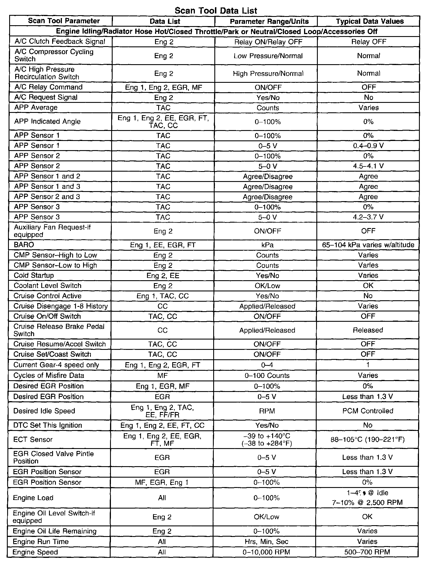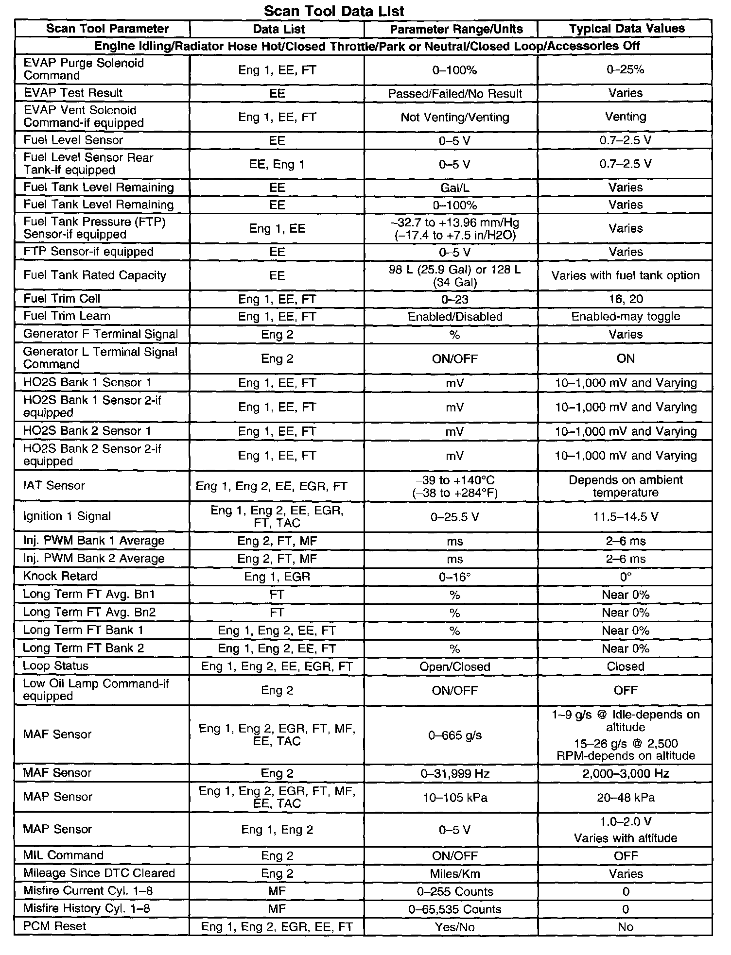 The Engine Scan Tool Data List contains all engine related parameters that are available on the scan tool. The list is arranged in alphabetical order. A given parameter may appear in any one of the data lists, and in some cases may appear more than once, or in more than one data list in order to group certain related parameters together.