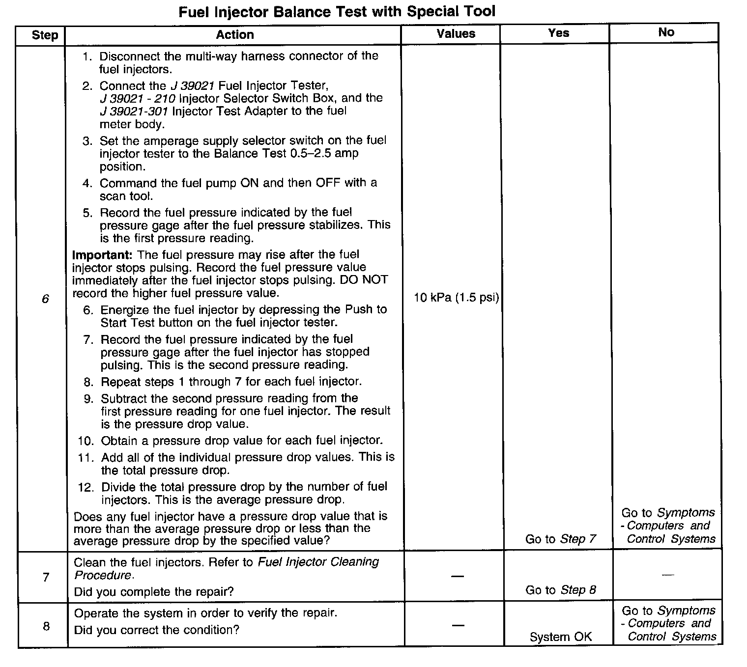 6. If the pressure drop value for each fuel injector is within 10 kPa (1.5 psi) of the average pressure drop value, the fuel injectors are flowing properly. Calculate the pressure drop value for each fuel injector by subtracting the second pressure reading from the first pressure reading. Refer to Fuel Injector Balance Test Example.
