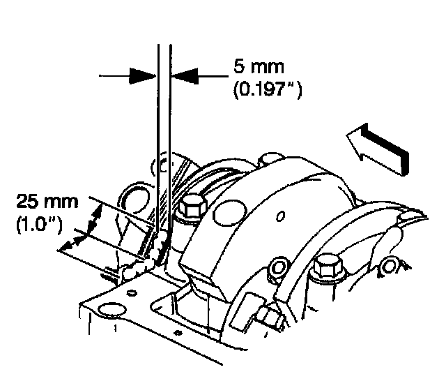 3. Apply a 5 mm (0.197 inch) bead of adhesive, GM P/N 12346141 or equivalent, 25 mm (1.0 inch) long to the engine front cover to the engine block junction at the Oil pan.