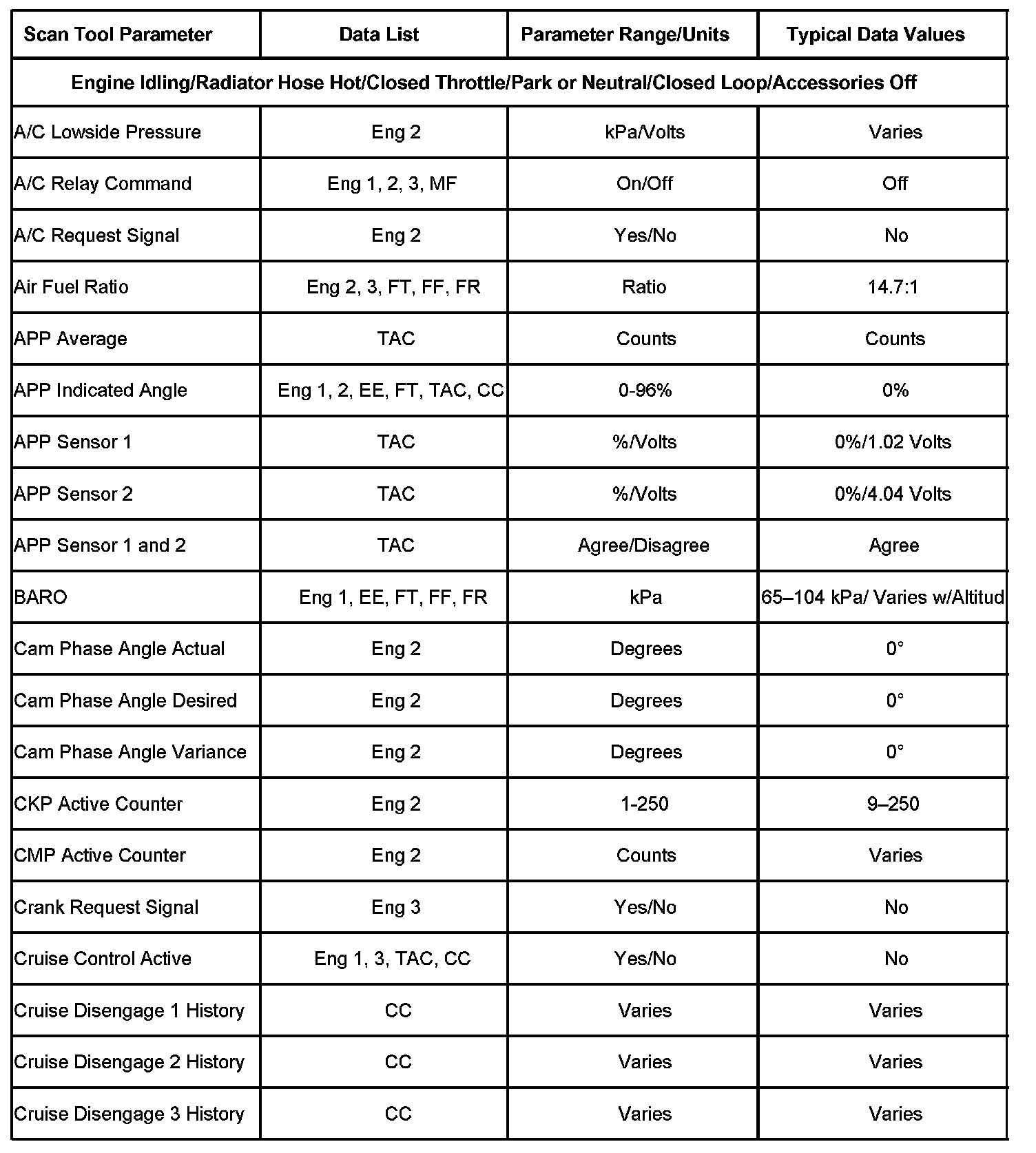 SCAN TOOL DATA LISTThe Engine Scan Tool Data List contains all engine related parameters that are available on the scan tool. The list is arranged in alphabetical order. A given parameter may appear in any one of the data lists, and in some cases may appear more than once, or in more than one data list in order to group certain related parameters together.