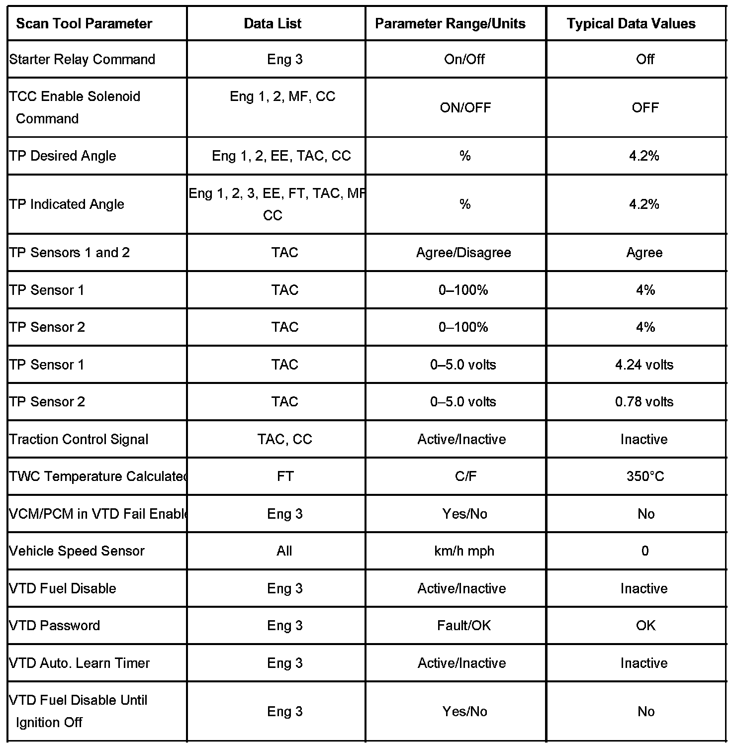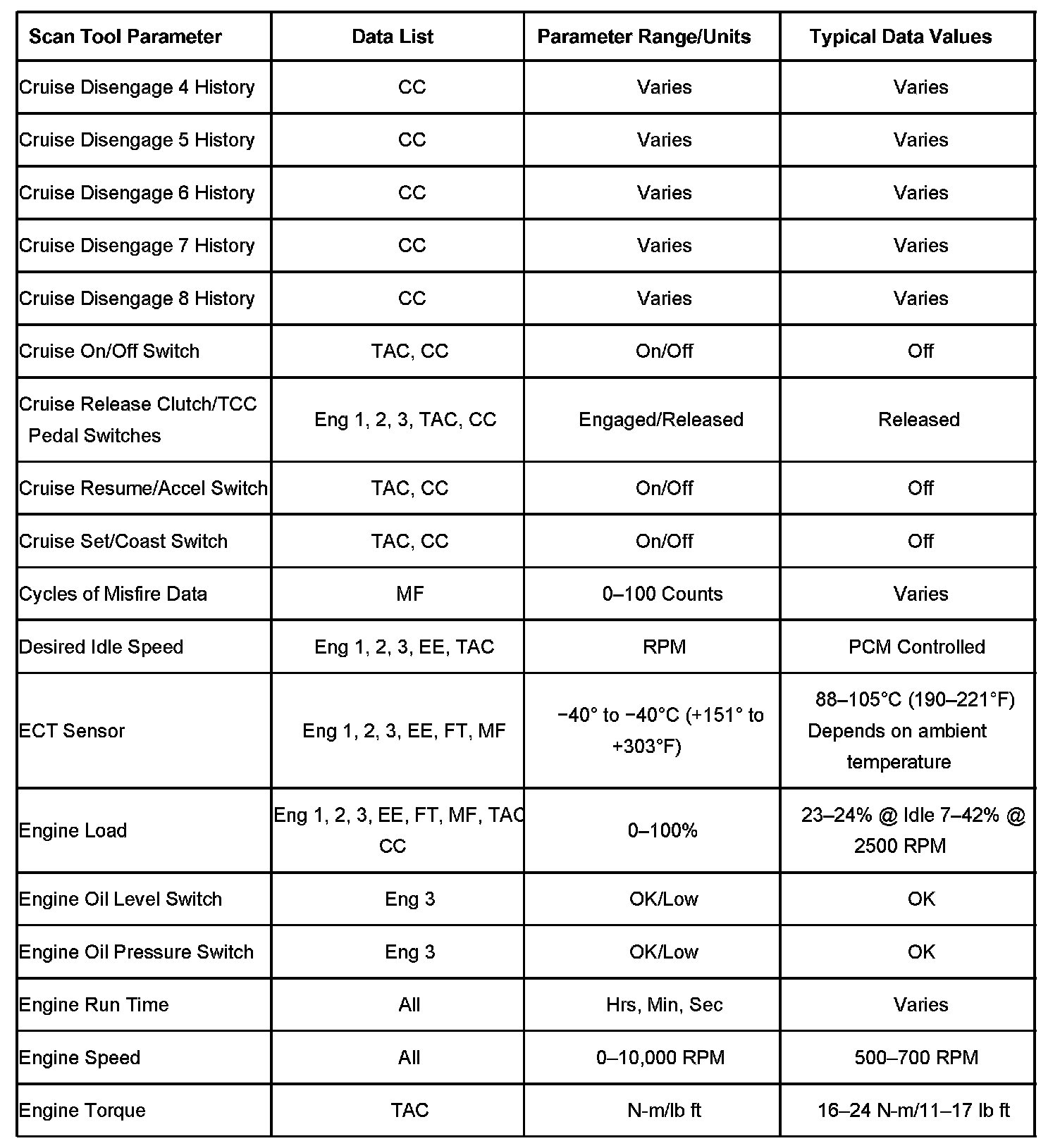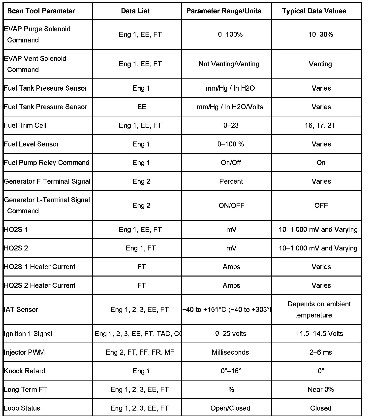 The column labeled Data List indicates where a parameter can be located on the scan tool. Refer to the scan tool operating manual for the exact locations of the data lists. The following is a description of each term listed: