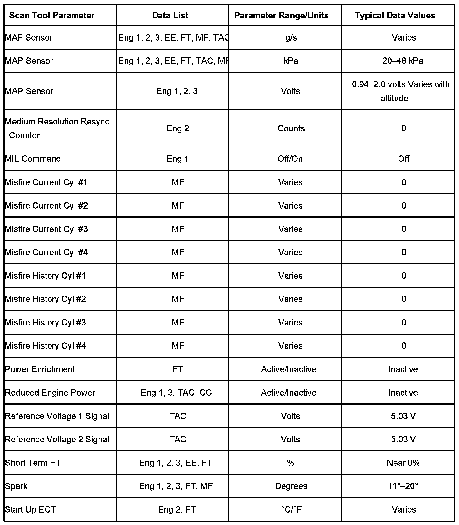 Scan tool values from a properly running engine may be used for comparison with the engine you are diagnosing. The Engine Scan Tool Data List represents values that would be seen on a normal running engine.