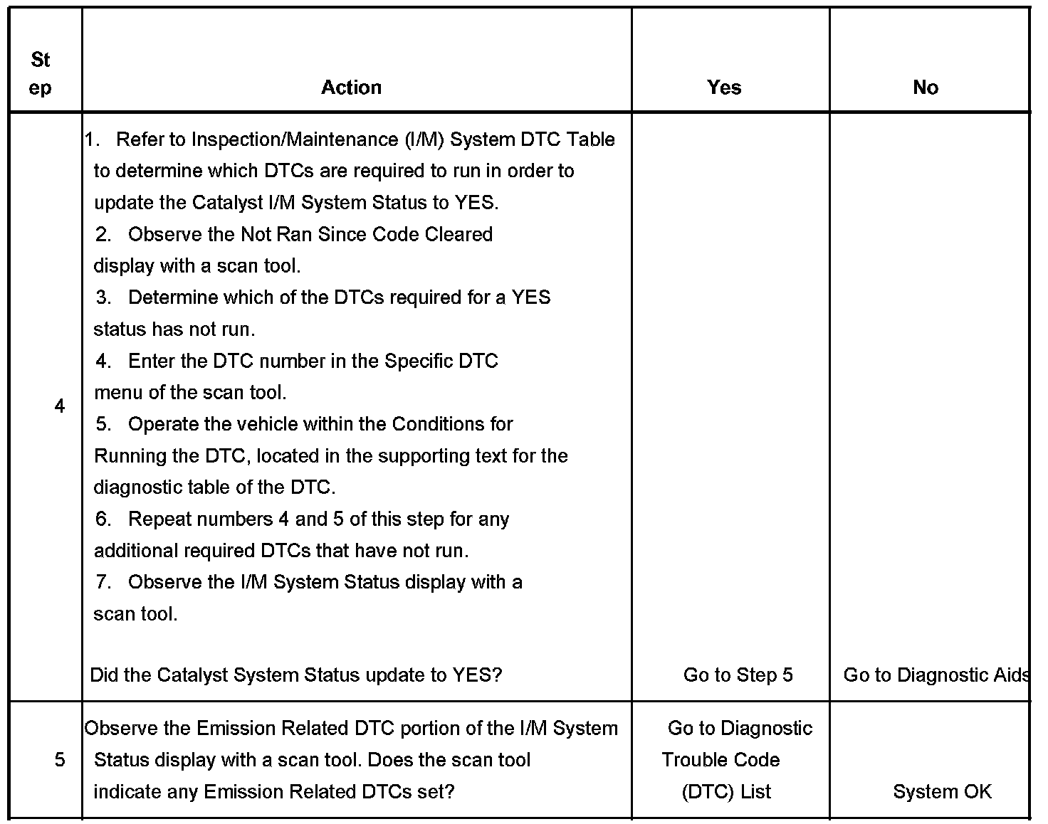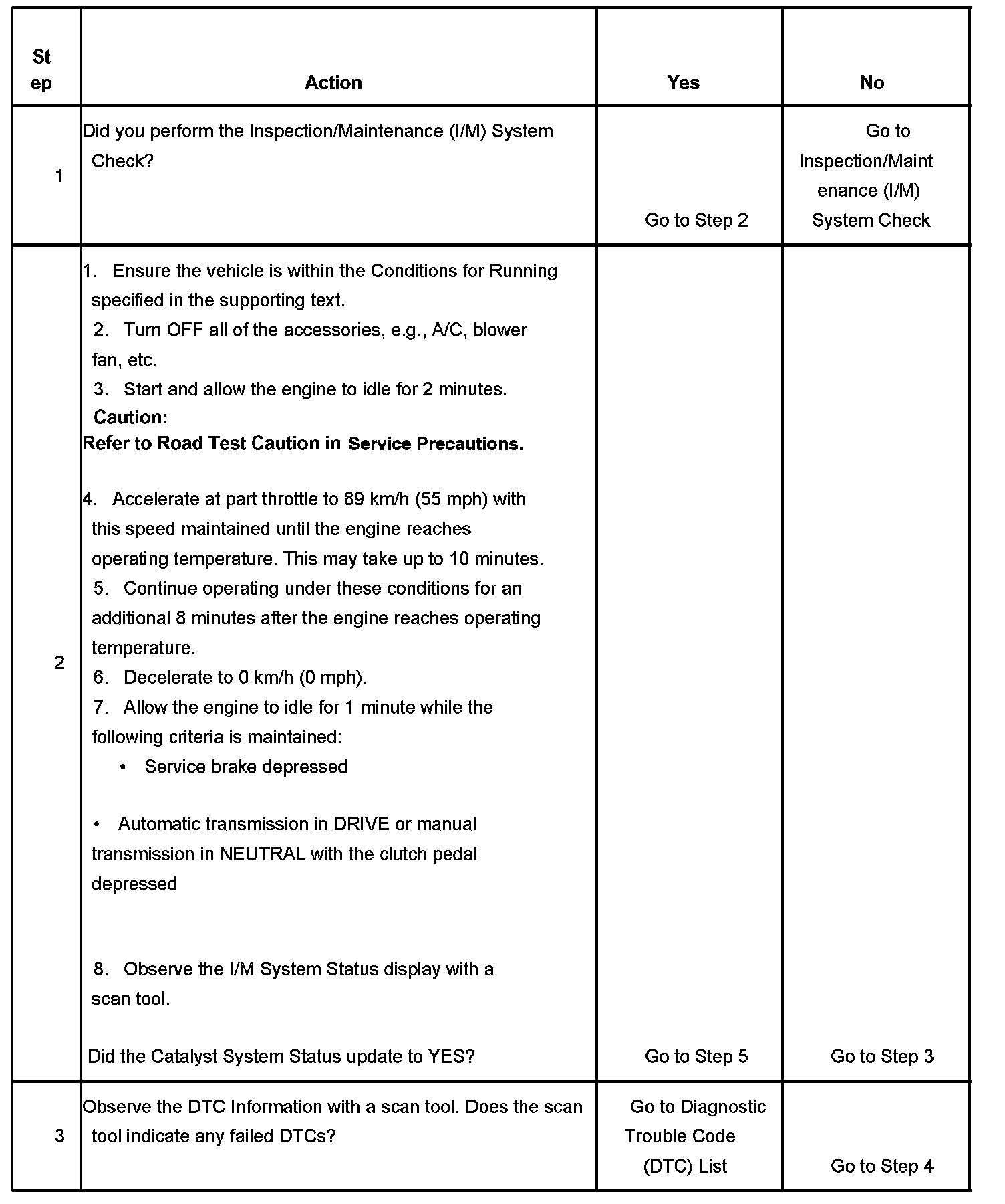 The purpose of this procedure is to satisfy the enable criteria necessary to execute an inspection/maintenance (I/M) system monitor for the catalyst system. The system monitor is comprised of the test results from one or more DTCs. This procedure may be used to set the Catalyst I/M System Status display on the scan tool to YES. The Catalyst I/M System Status display indicates whether or not the control module has completed the system monitor. The system monitor completes when either all DTCs comprising the monitor run and pass, or any DTC comprising the monitor illuminates the malfunction indicator lamp (MIL). If one of the DTCs comprising the monitor is set and the MIL is not illuminated, the necessary trips are required to illuminate the MIL before the monitor will complete. Once the monitor completes, the Catalyst I/M System Status display will be updated to YES.